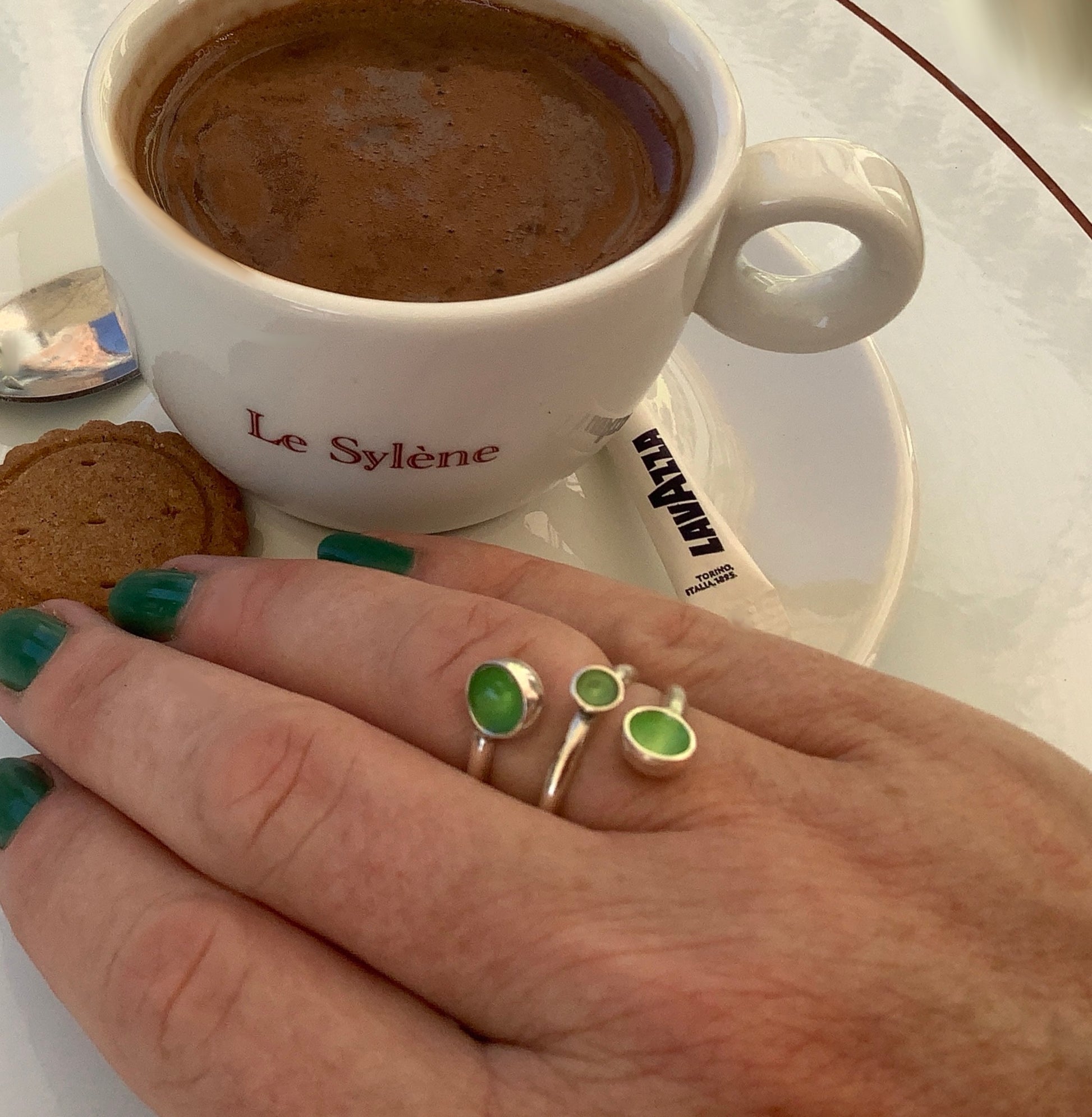 Sterling silver ring with dark fluorescent green enamel which should fit most sizes (let me know if you are very petite or larger) and adjusts to your finger. You can lose or gain weight, get hot or cold or guesstimate the size of a friend’s finger, as a present.