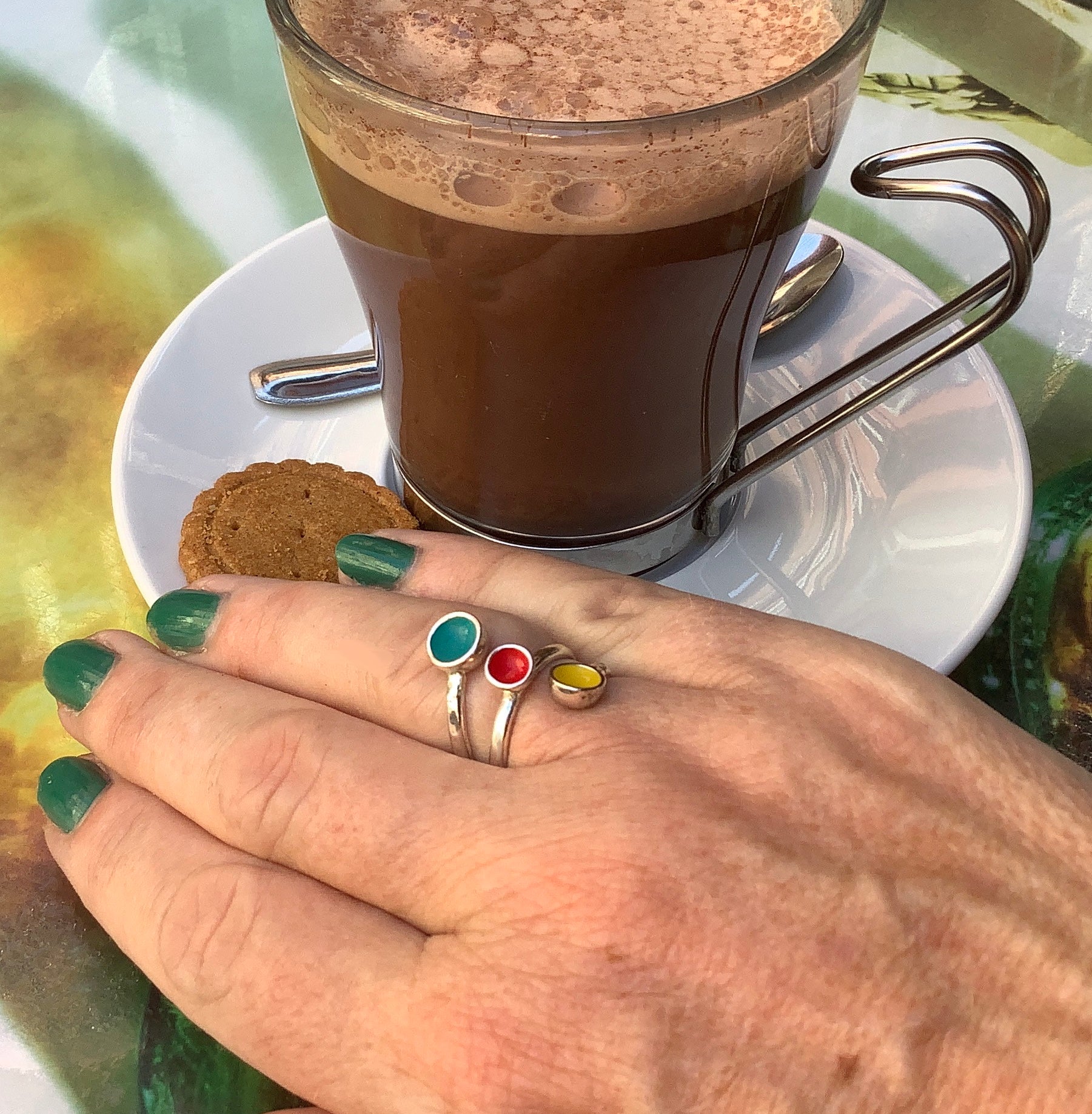 Sterling silver ring with red, blue and yellow enamel which should fit most sizes (let me know if you are very petite or larger) and adjusts to your finger. You can lose or gain weight, get hot or cold or guesstimate the size of a friend’s finger, as a present.